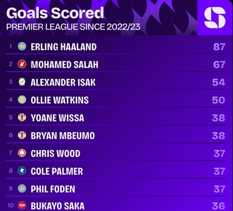 哈兰德自2022年登陆英超后打进87球,比同时其他球员齐多至少20球
