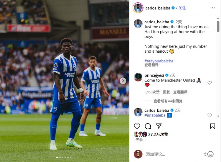 8月19日讯 布莱顿中场巴莱巴日前在Instagram晒出赛场照,指摘区很多球迷邀请他加盟曼联。