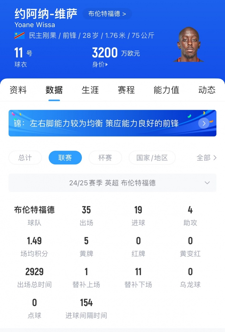 28岁的维萨还有1年条约,球员24-25赛季39场20球4助攻,德回身价3200万欧。