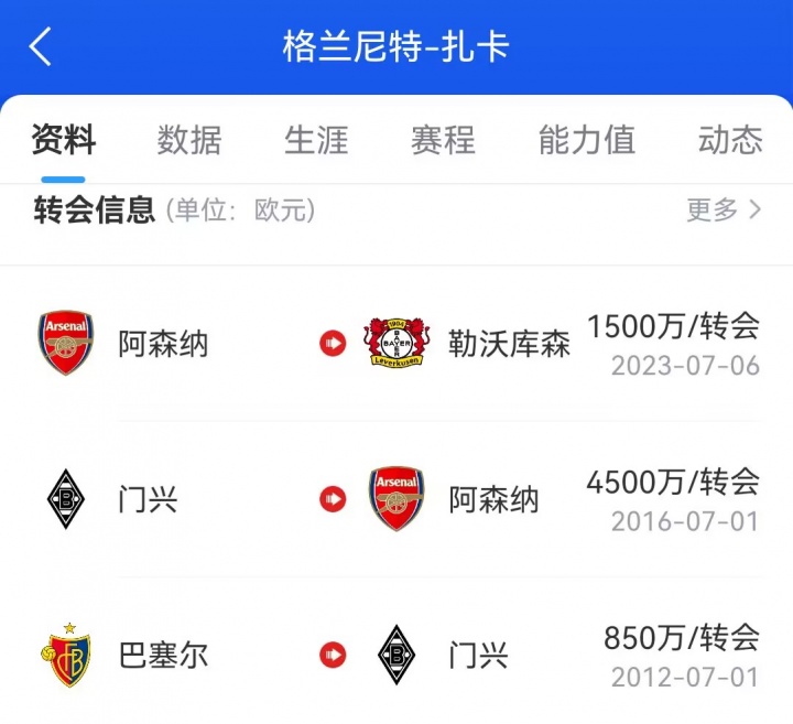 扎卡2023年以1500万欧元从阿森纳转会至勒沃库森,此前曾为阿森纳效率7年,并一度担任阿森纳队长。离开两年后,瑞士中场重返英超。