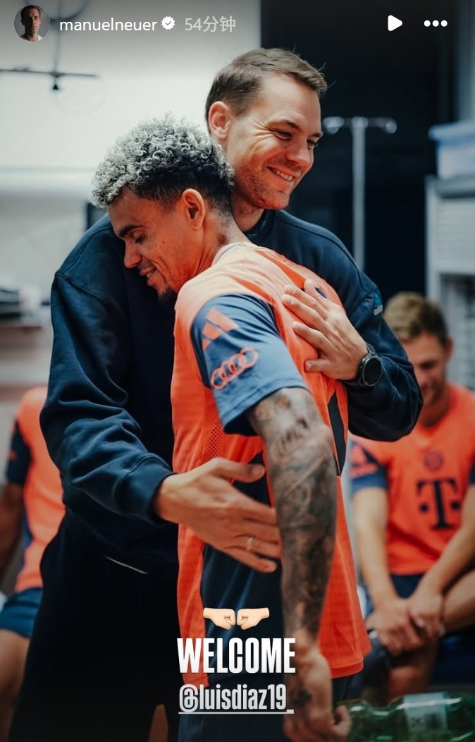 诺伊尔通过社媒晒出我方在拜仁更衣室和新援迪亚斯相拥的相片,并配文:“迎接@路易斯-迪亚斯。”