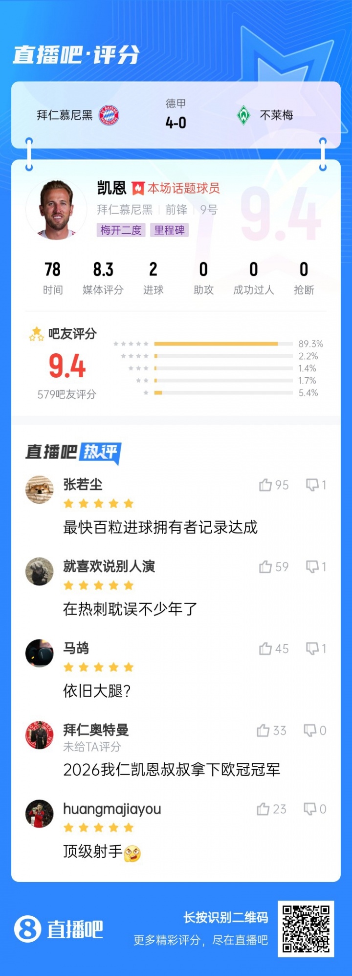 第五轮评比效果结出炉,凯恩梅开二度斩获个东说念主拜仁百球,匡助拜仁4-0打败不莱梅,赢得吧友4万多票复旧,当选【X小红书德甲第5轮最好球员】!