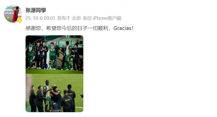 10月6日讯 昨晚,北京国安俱乐部官方文告主帅塞蒂恩离任。国安球员张源更新个东谈主微博,向塞蒂恩奉上祝颂。