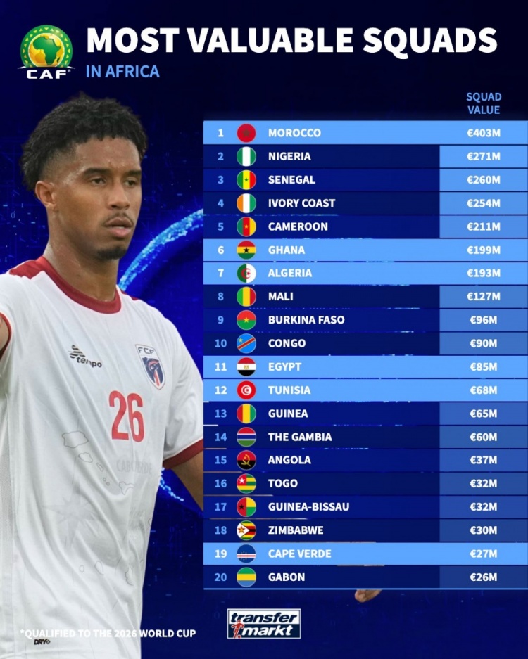 进击宇宙杯!佛得角总身价2700万欧,名次非洲球队第19位!
