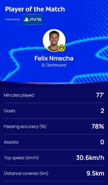 2射正2进球,欧冠官方:恩梅查当选多特4-2哥本哈根一役全场最好