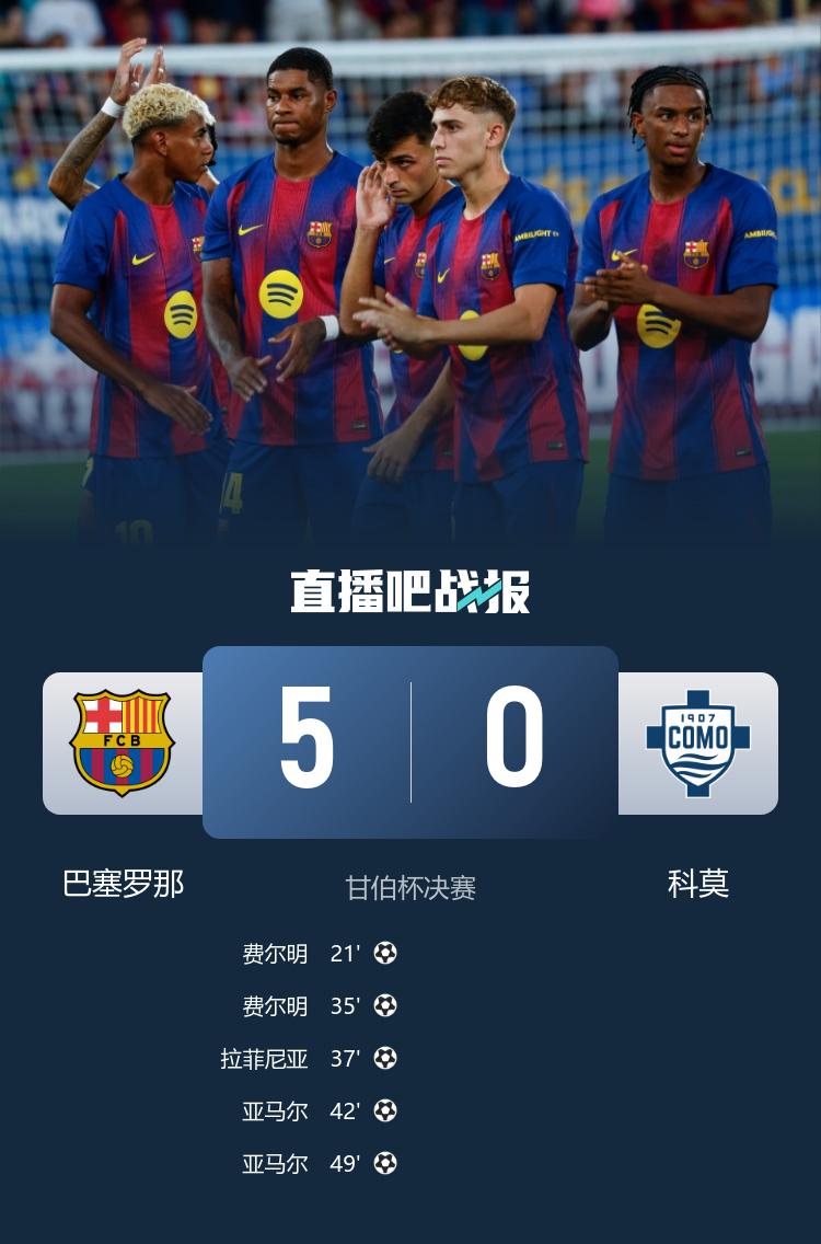 甘伯杯,巴萨5-0大捷科莫,费尔明、亚马尔梅开二度,拉菲尼亚进球。