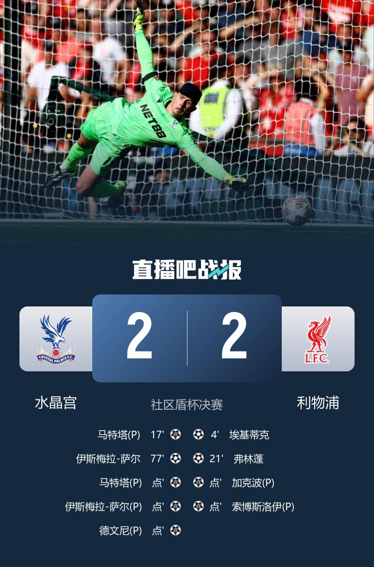 社区盾杯决赛水晶宫点球大战战得胜物浦,夺得社区盾,萨拉赫、麦卡利斯特失点。
