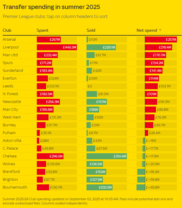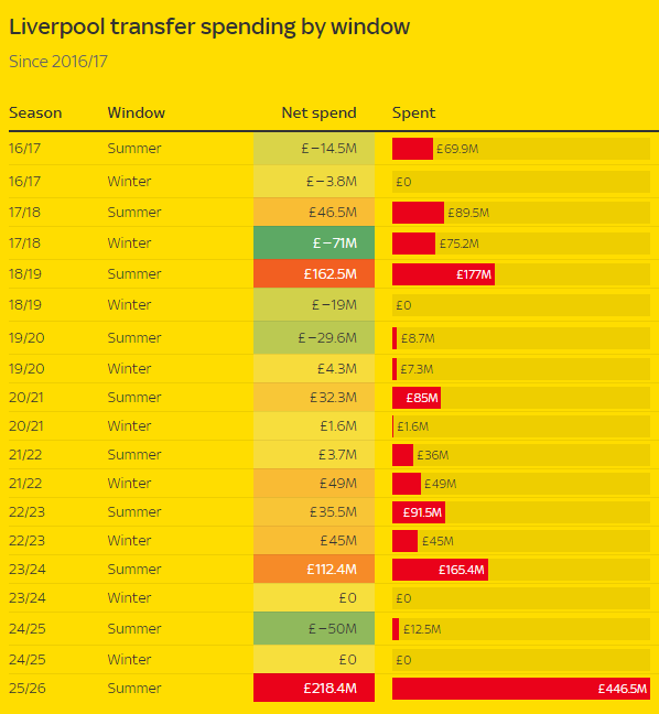 利物浦2025年夏窗的净支拨为2.18亿英镑,自2016-17赛季以来夏窗插足仅排行第4位,低于2022-23赛季冬窗、夏窗的切尔西、2025-26赛季的阿森纳。