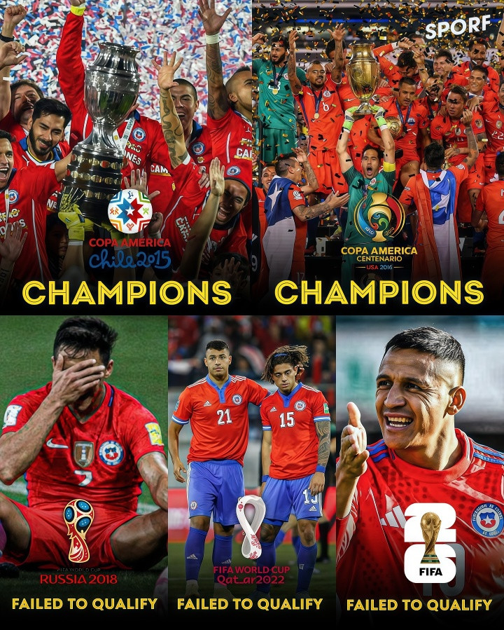 已经在2015、16年连夺两届好意思洲杯的智利,聚拢3届无缘寰宇杯决赛圈,令东谈主唏嘘。