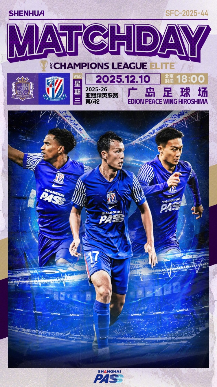 12月10日18:00,2025/26亚冠精英联赛第6轮 广岛三箭vs上海申花
