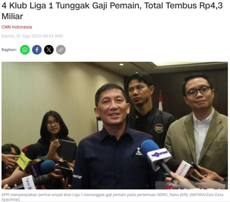 8月7日讯 据印尼媒体报说念,印尼奇迹球员协会泄露,4家印尼超等联赛俱乐部拖欠球职工资。