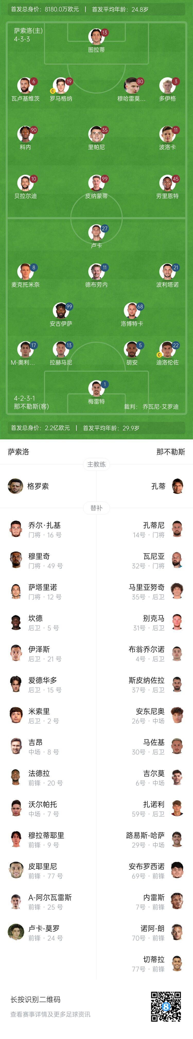 8月24日讯 00:30意甲联赛第一轮,那不勒斯客场对阵萨索洛。赛前,两边公布了本场比赛的首发声威。