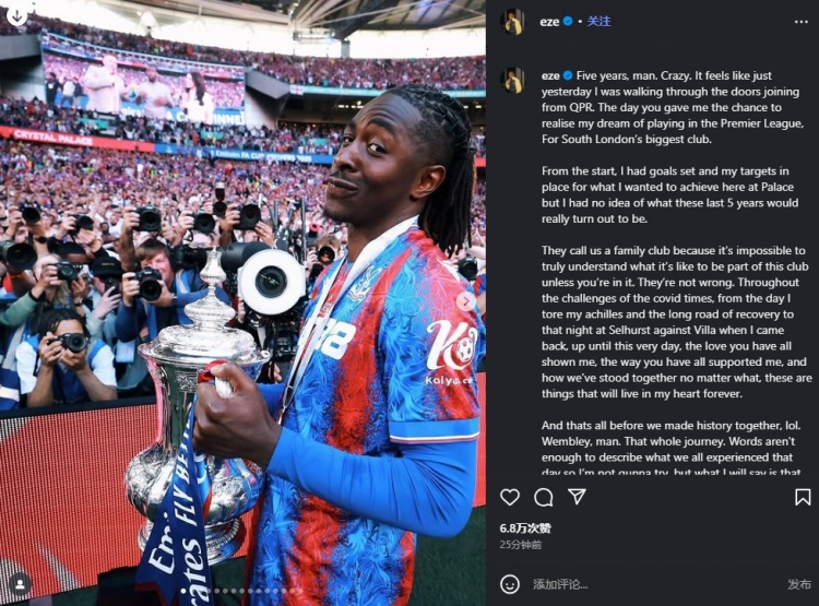 8月24日讯 转会阿森纳的埃泽更新社媒告别水晶宫。