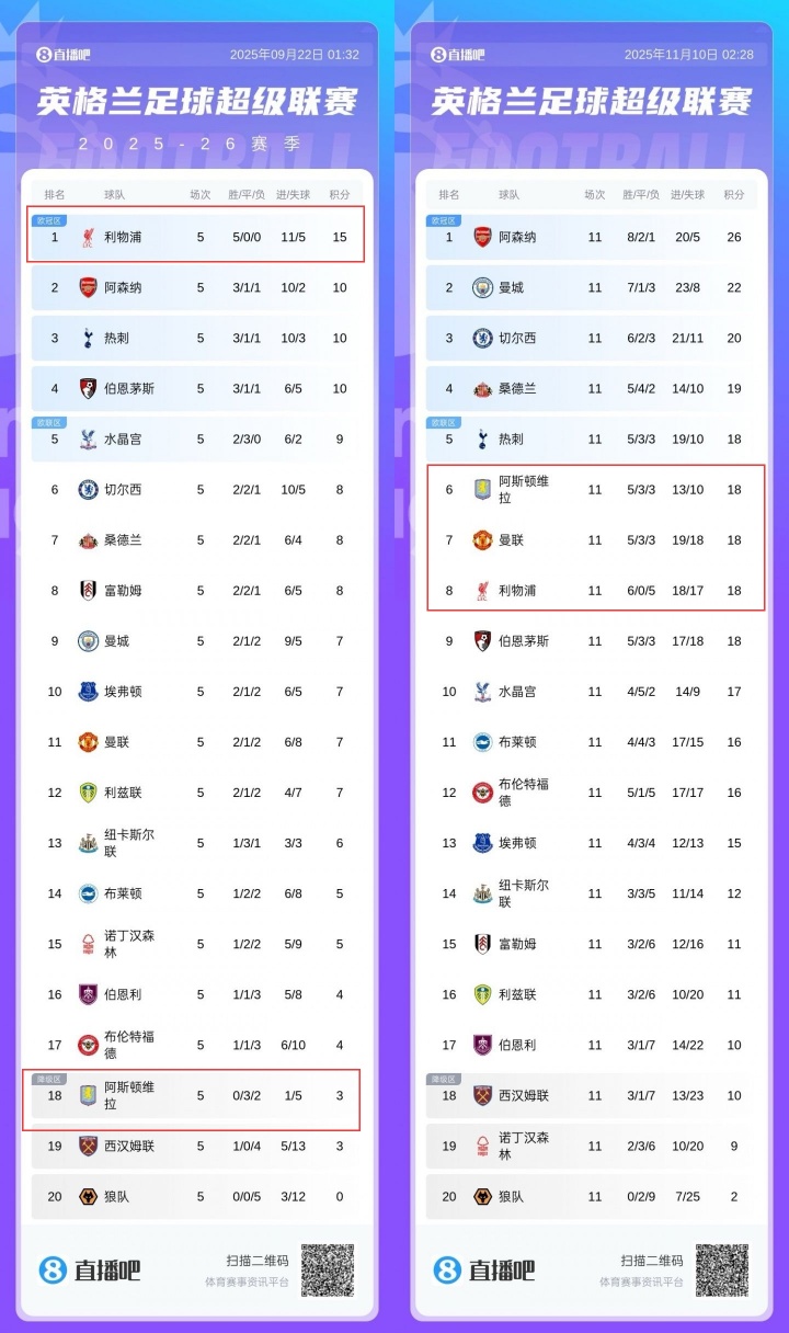 双向奔赴!第5轮时利物浦第1维拉第18,现维拉反超赤军两队同分