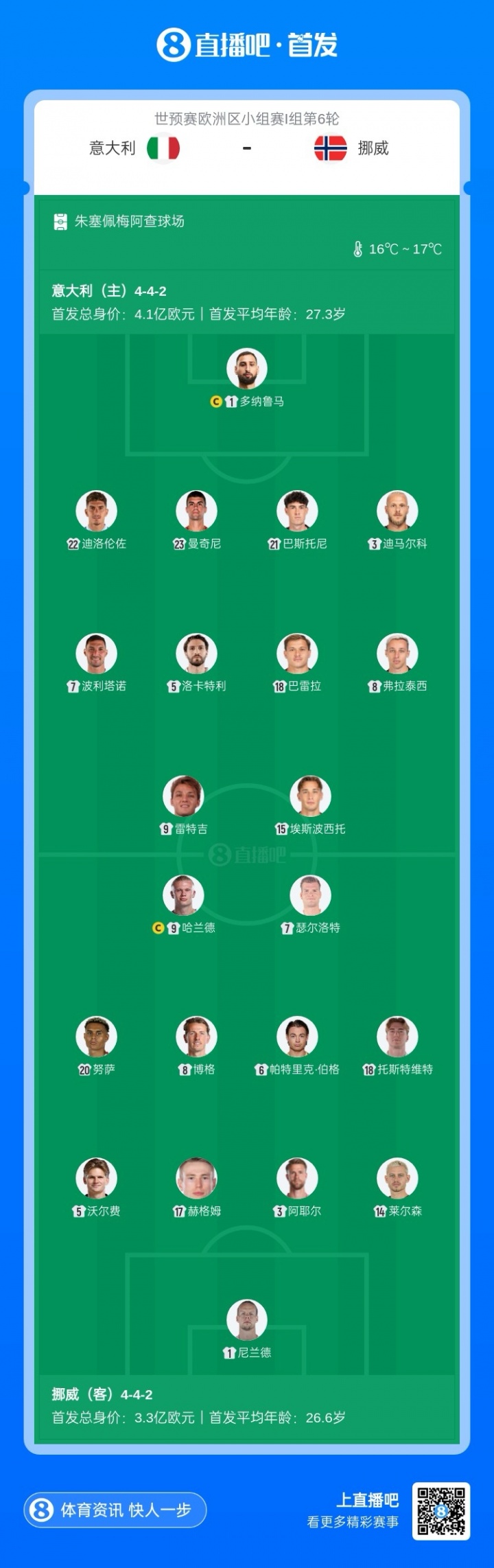 11月17日讯 世初赛欧洲区小组赛I组第6轮,意大利末轮要道战,主场迎战挪威,赛前两边首发公布。