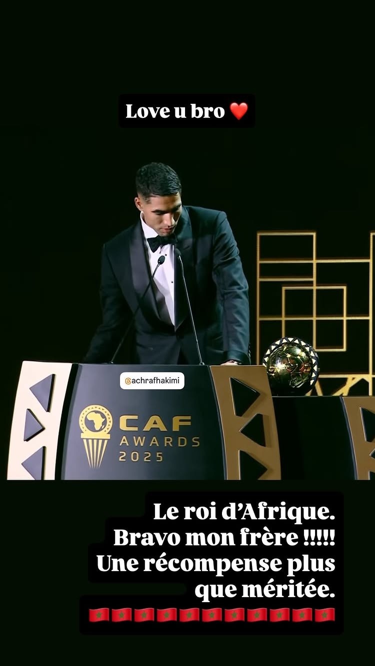 他的好友姆巴佩也通过社媒晒出阿什拉夫的获奖照,并配文:“爱你,兄弟!非洲之王。干得漂亮,我的兄弟...这份荣誉实至名归。”