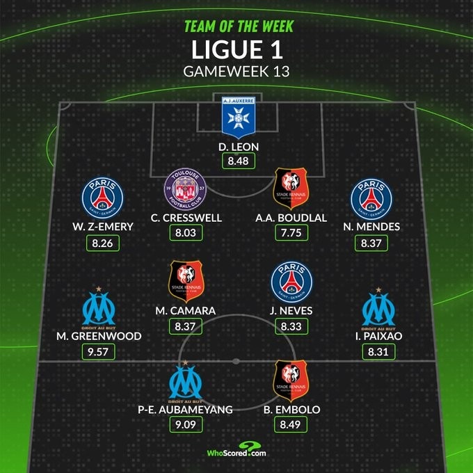 中场:梅森·格林伍德(马赛,9.57分)、梅赫迪·卡马拉(雷恩,8.37分)、若昂·内维斯(巴黎,8.33分)、伊戈尔·派尚(马赛,8.31分)