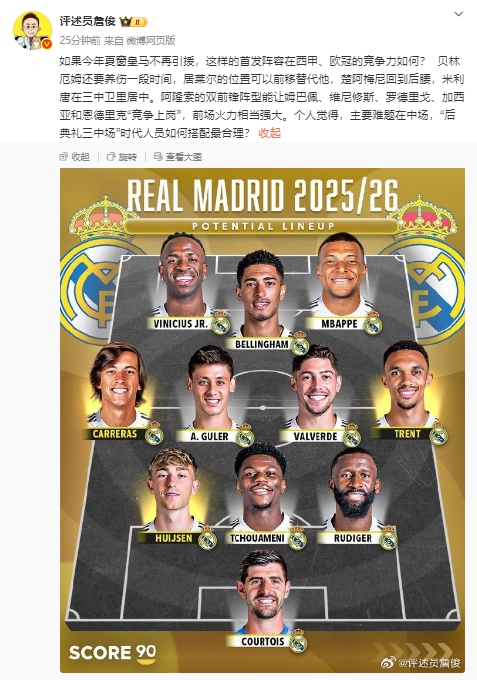 08月05日讯 知名评述员詹俊在个东谈主社媒上晒出了皇马新赛季的潜在首发流露图,并对此进行了驳倒。