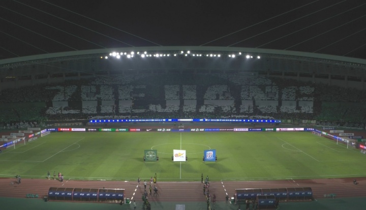 轰动!浙江赛前看台亮出巨型TIFO,本体为浙江的拼音