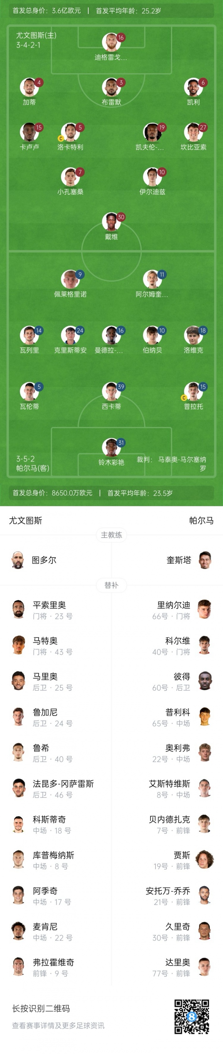 尤文图斯替补:23-平索里奥、43-马特奥-福斯卡尔多、24-鲁加尼、25-若昂-马里奥、40-鲁希、8-库普梅纳斯、17-阿季奇、18-科斯蒂奇、22-麦肯尼、9-弗拉霍维奇、11-尼科-冈萨雷斯