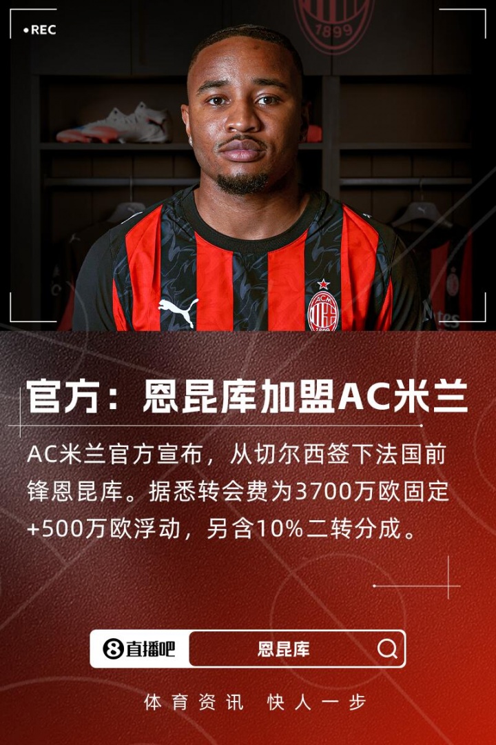 总价4200万欧+10%二转!官方:AC米兰签下27岁切尔西前卫恩昆库