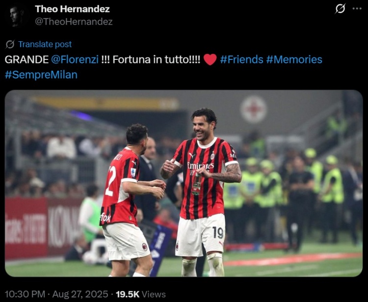 弗洛伦王人的前队友特奥更新社媒,晒出两东谈主共同着力米兰时的赛场面照,为他奉上祝愿。