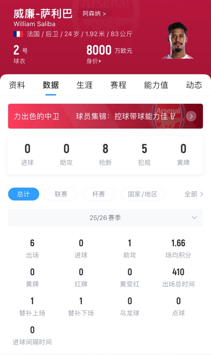 萨利巴现年24岁,法国中卫,阿森纳在2019年破耗3000万欧元将其从圣埃蒂安签下。当今萨利巴猜测代表枪手出战139次,孝敬7球3助,随队获利两个社区盾冠军。当今球员德回身价为8000万欧元。