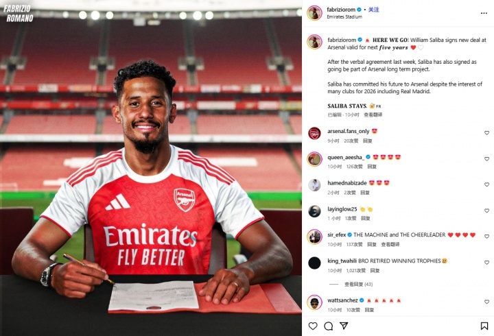 09月30日讯 罗马诺用标记性的Here We Go晓谕,萨利巴将与阿森纳签下5年新约。