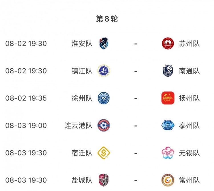 “苏超”第8轮将于下周末进行,其中8月2日,镇江队对战南通队,徐州队对战扬州队;8月3日,盐城队对战常州队。