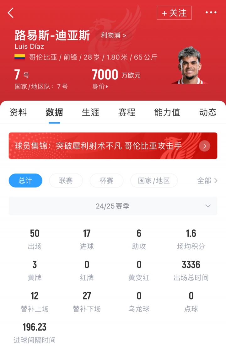 上赛季,迪亚斯为利物浦出场50场,取得了17粒进球和6次助攻,现在其德回身价为7000万欧元。