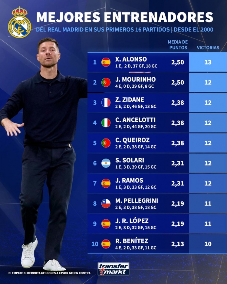 10月10日讯 德国转会商场统计了2000年以来皇马主帅前16场比赛的收效场次,并排出榜单,阿隆索13胜居首,穆里尼奥、皆达内、安切洛蒂12胜。