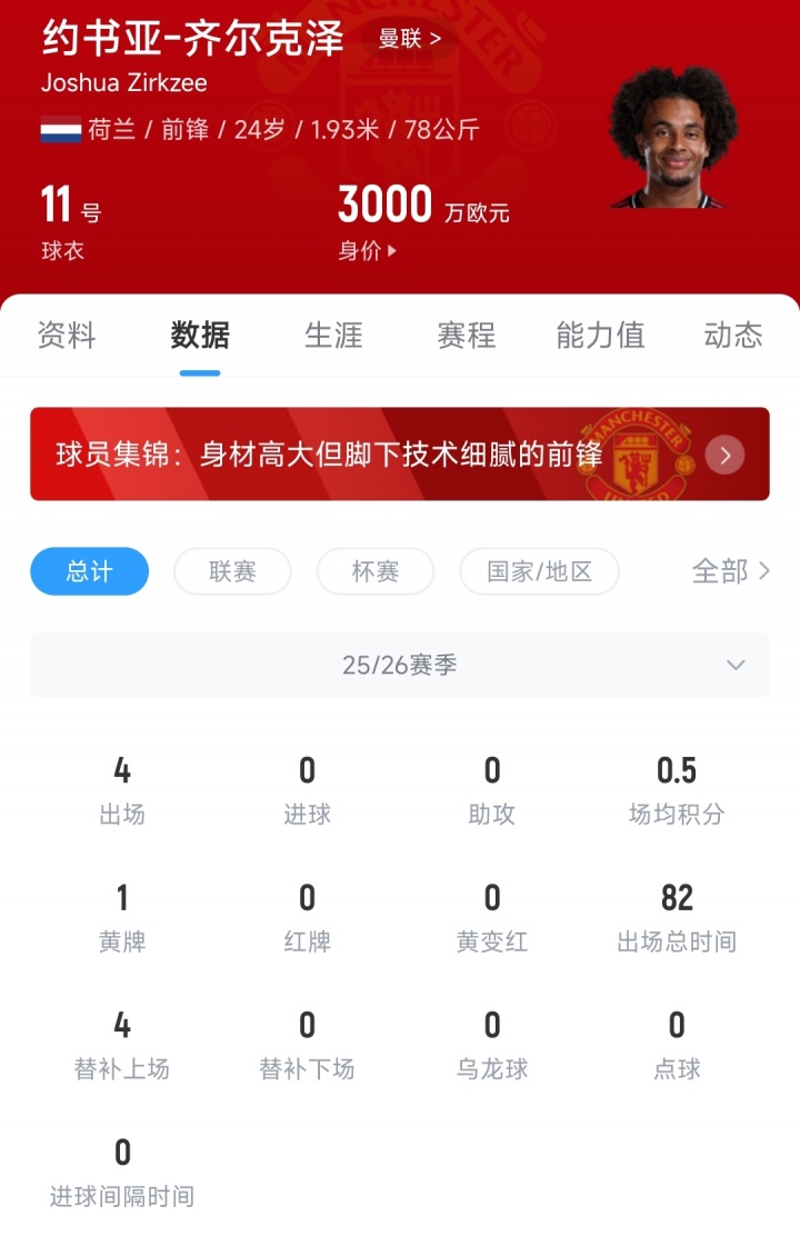 2024年夏窗,时任曼联主帅滕哈赫破耗4250万欧元,从博洛尼亚签下了我方的荷兰老乡王人尔克泽。加盟曼联于今,王人尔克泽共代表球队出战53场比赛,孝敬7粒进球和3次助攻,当今24岁的王人尔克泽德回身价为3000万欧元。