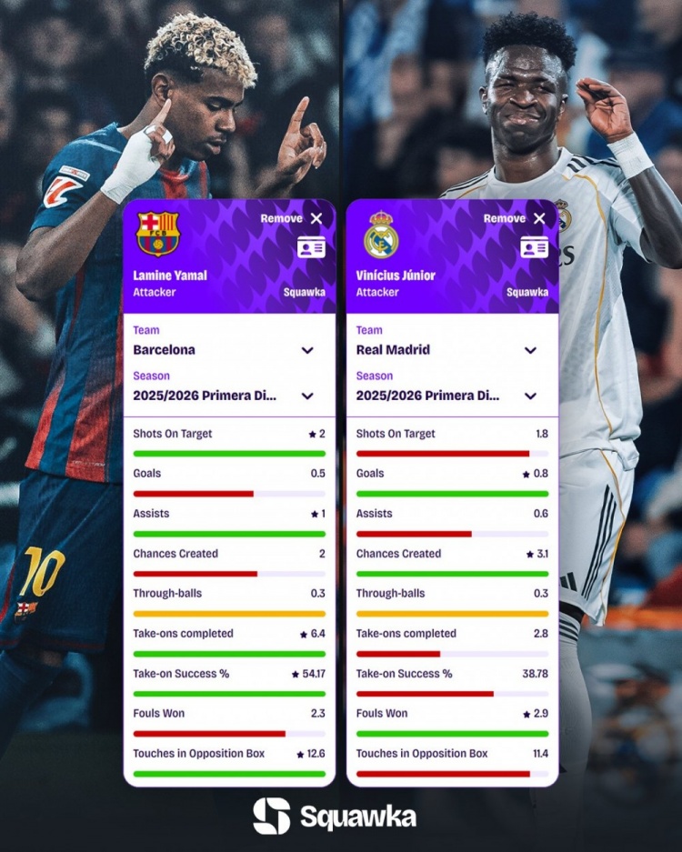 10月25日讯 皇马和巴萨将在本轮西甲焦点对决,数据机构squakwa对比了亚马尔与维尼修斯在2025/26赛季西甲关键数据(加粗项为上风数据):