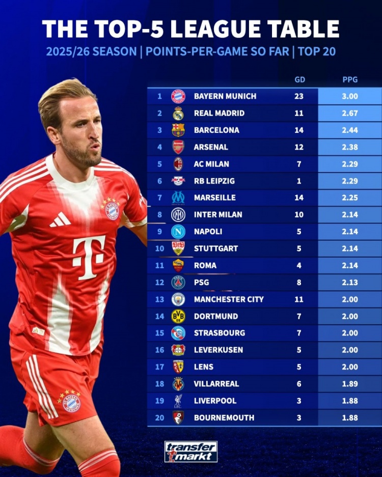 10月25日讯 《转会市集》统计了本赛季五大联赛球队的场均拿分情况,拜仁、皇马、巴萨、阿森纳分列前四。