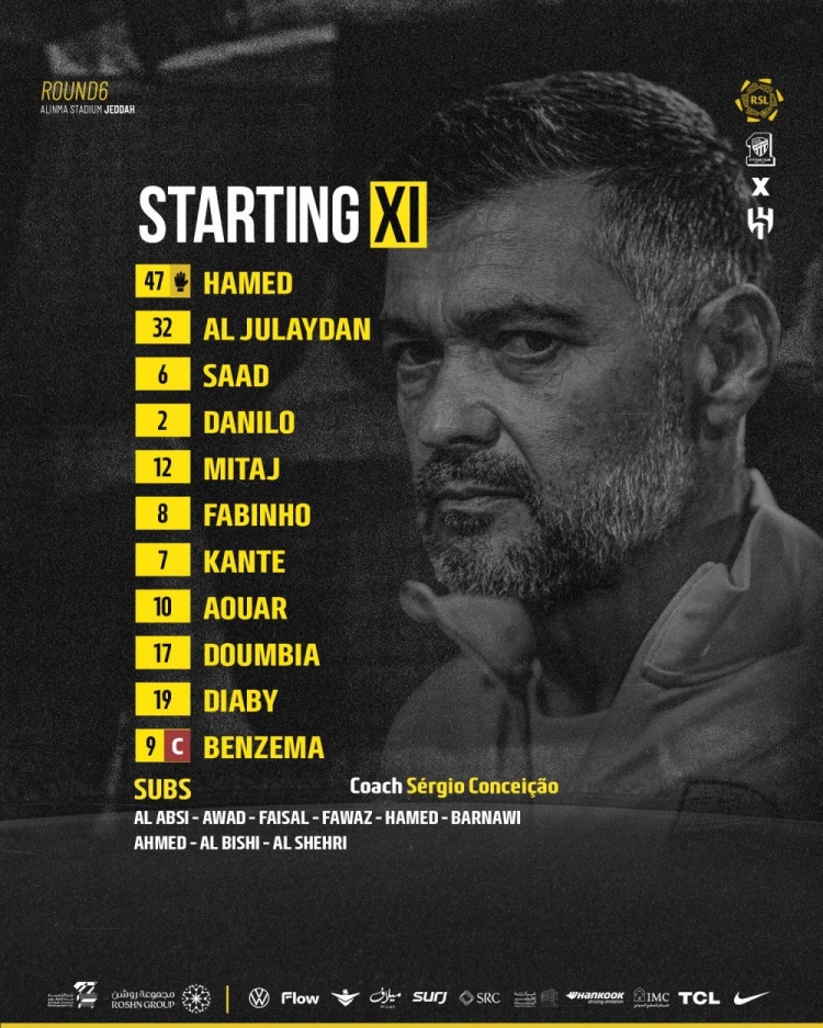 吉达取悦首发:47-哈麦德、32-朱莱丹、6-萨德-穆萨、2-达尼洛、12-米塔赫、8法比尼奥、7-坎特、10-奥亚尔、17-敦比亚、19-迪亚比、9-本泽马