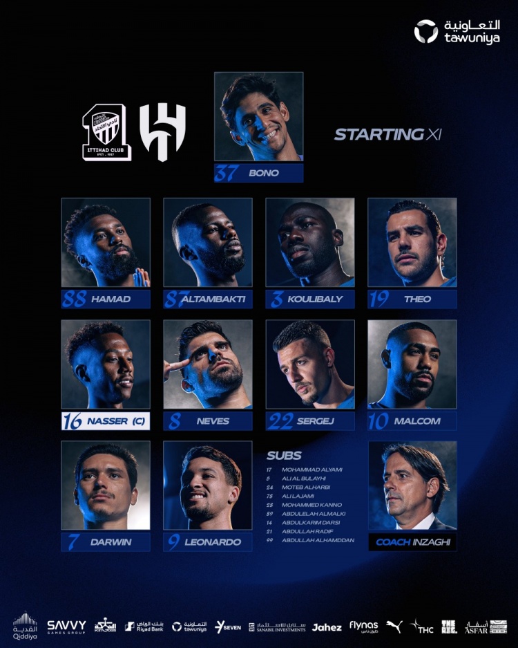 利雅得月牙首发:37-布努、19-特奥、3-库利巴利、87-坦巴蒂、88-哈马德-亚米、10-马尔科姆、22-米林科维奇、8-鲁本-内维斯、16-纳赛尔-多萨里、9-莱昂纳多、7-努涅斯
