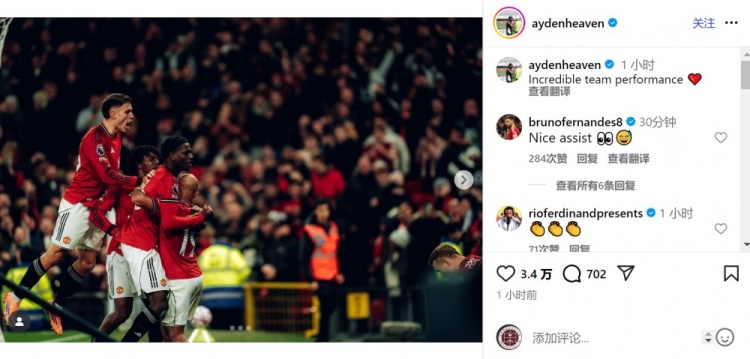 10月26日讯 英超第9轮比赛,海文替补出场送出助攻,曼联主场4-2打败布莱顿。