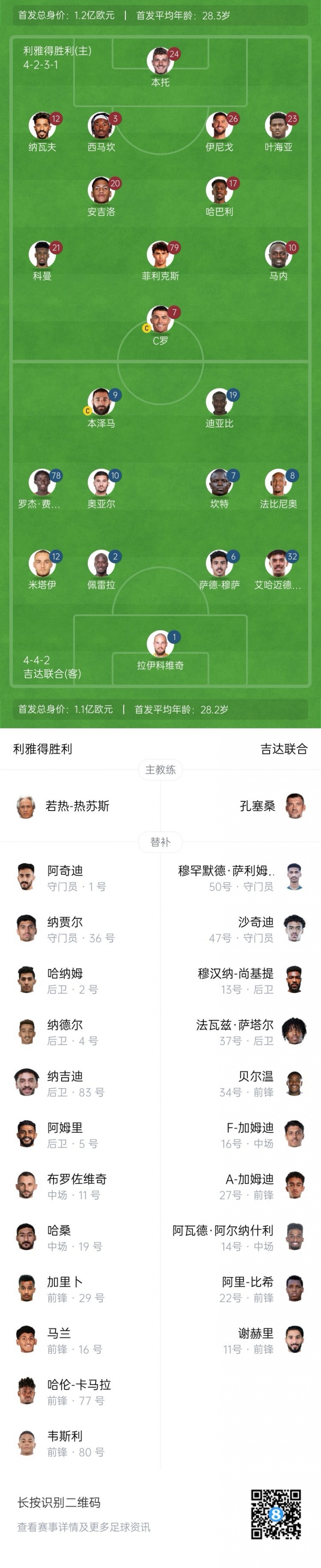 吉达鸠合首发:1-拉伊科维奇、32-朱莱丹、6-萨德·穆萨、2-达尼洛·佩雷拉、12-米塔伊、8-法比尼奥、7-坎特、10-奥亚尔、78-罗杰·费尔南德斯、19-迪亚比、9-本泽马