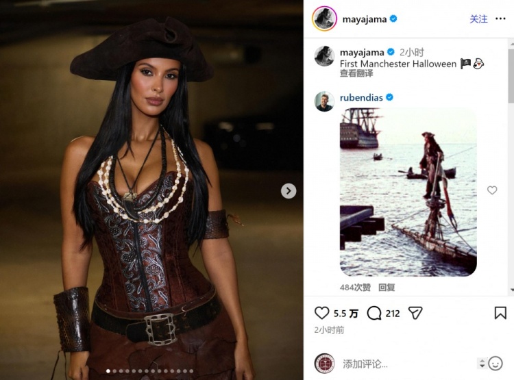 万圣节之际,鲁本-迪亚斯与女友玛雅-贾马COS加勒比海盗,玛雅-贾马社媒晒出像片,配文:“在曼彻斯特渡过的首个万圣节。”
