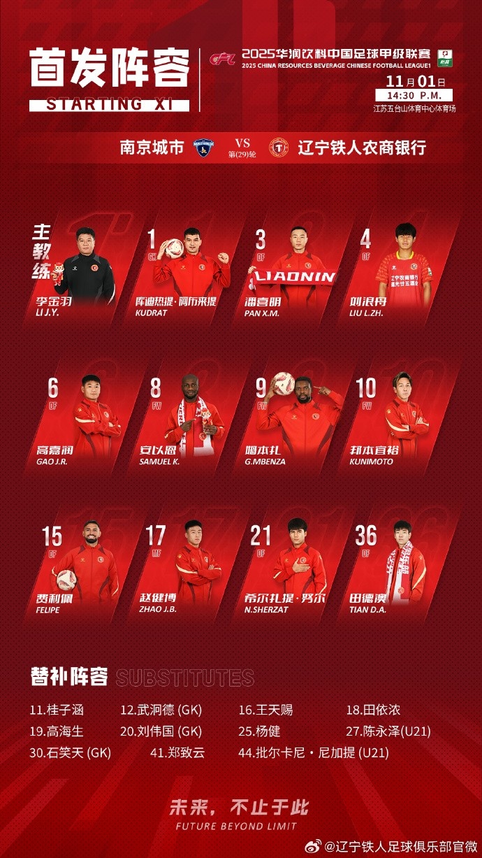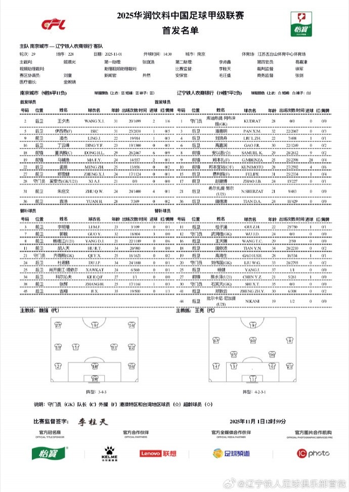 中甲第29轮,南京城市vs辽宁铁东说念主首发名单!